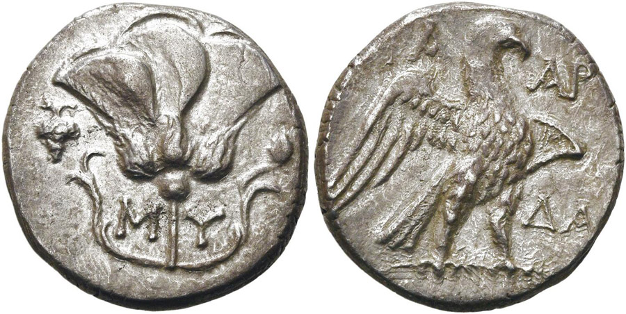 Başkent Mylasa, Karya bölgesinin Pers satrabı Maussolos [ΜΑΥΣΣΩΛΟΣ] tarafından Halikarnassos'a taşınmış ancak Mylasa [ΜΥΛΑΣΑ] antik kenti önemini kaybetmemiştir. Bu noktada antik sikkelerde görülen Apollo/Helios'un bakan başı, Karya'nın tetradrahmi kategorisinde olan antik sikkelerinin standart ön yüz tipi haline gelmiştir.